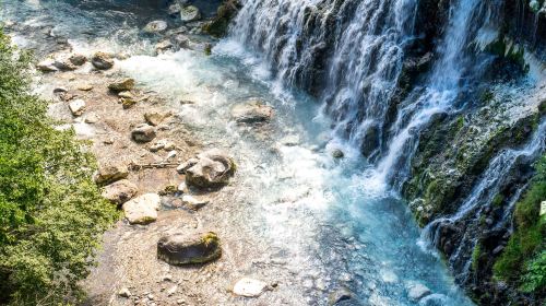 瀑布有着独特的瀑蓝水,远远看去,湛蓝的湖水美不胜收。瀑布下湖中的潭水,随着气候的变化会呈现出不同的颜色。瀑布的规模不大,游玩时你还可以下水嬉戏。